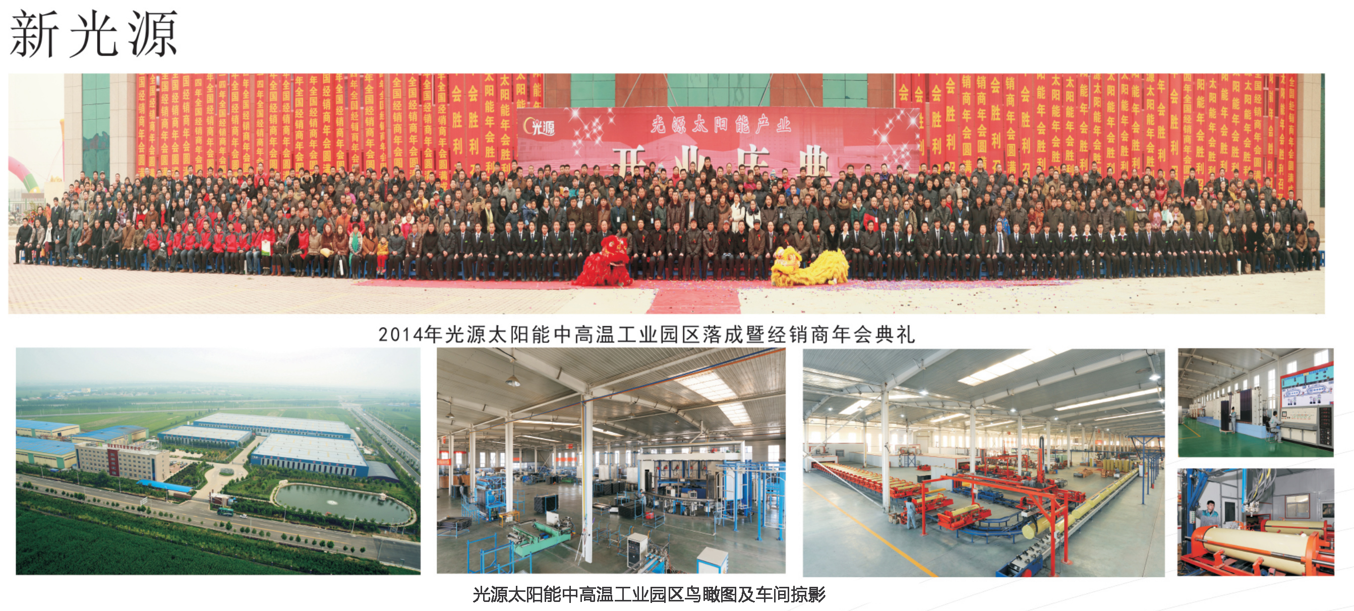 2013年12月光源公司搬遷到新廠區,如今的光源公司,以黨的路線方針和政策為指導,以科技發展與創新為契機,以太陽能開發與利用為訴求,不僅夯實了太陽能熱水系統等傳統產品的基石,更在新能源產品的開發中屢戰佳績。