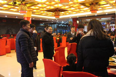 晚會結束后,春節晚宴開始。董事長李成彬、總經理劉迎波與公司領導來到員工中間,向員工敬酒,祝賀新年。