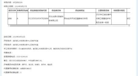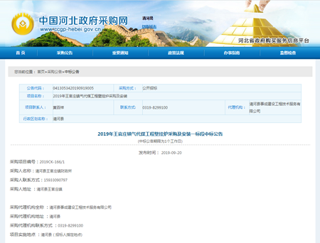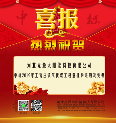 喜報頻傳,河北光源太陽能科技有限公司,在2019年09月16日,2019年王官莊鎮氣代煤工程壁掛爐采購及安裝項目的競標中,憑借過硬的產品質量,扎實高效的工作作風,卓越的運作團隊和良好的企業信譽,以絕對的優勢順利中標。