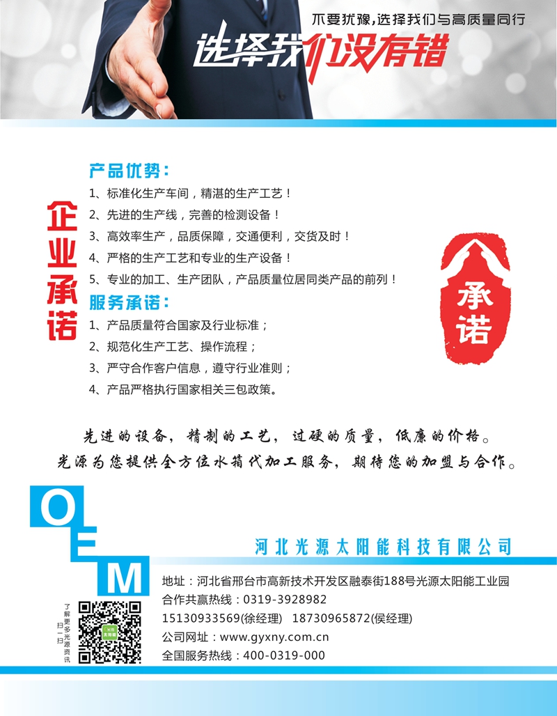謙尊而光,酌水知源。前行中的光源太陽(yáng)能,感恩客戶,固本創(chuàng)新,以振興民族太陽(yáng)能光熱產(chǎn)業(yè)為己任,將“打造太陽(yáng)能世界品牌”作為企業(yè)發(fā)展目標(biāo),高歌奮進(jìn),光耀東方!
